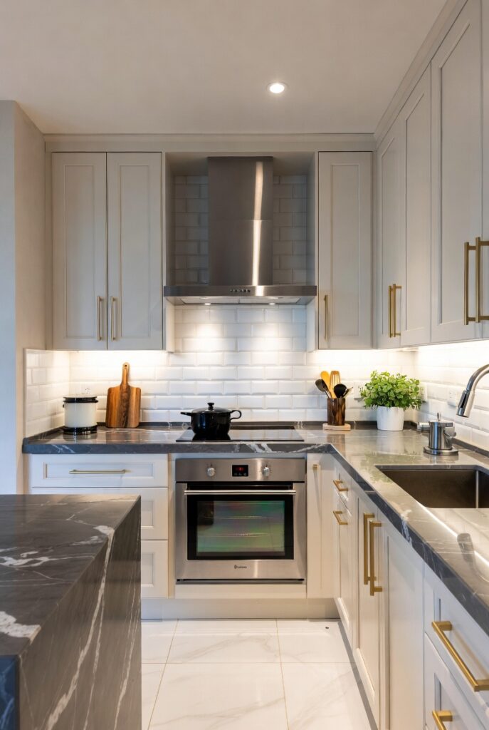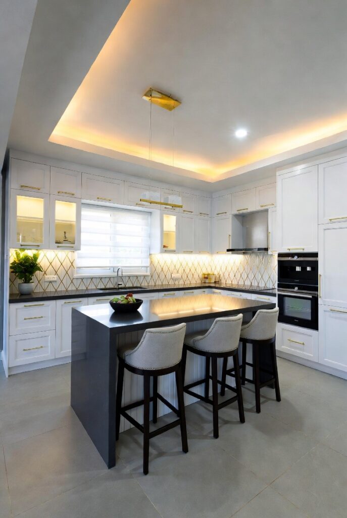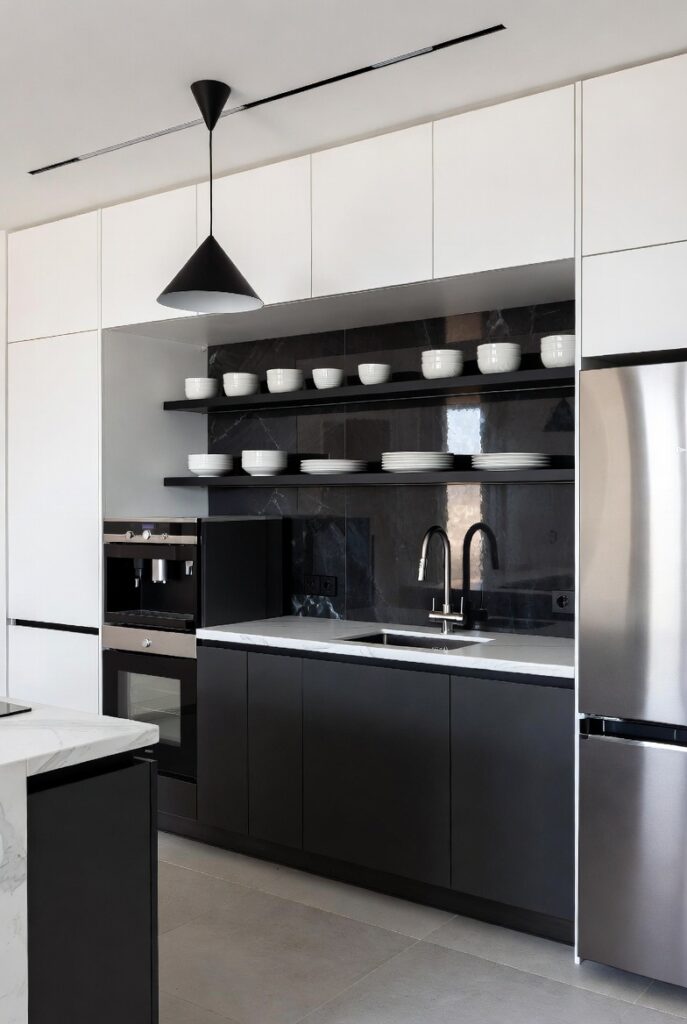 Black kitchens are bold and dramatic, but lighting is key. LED strips, under-cabinet lights, and warm accents prevent the space from feeling heavy.