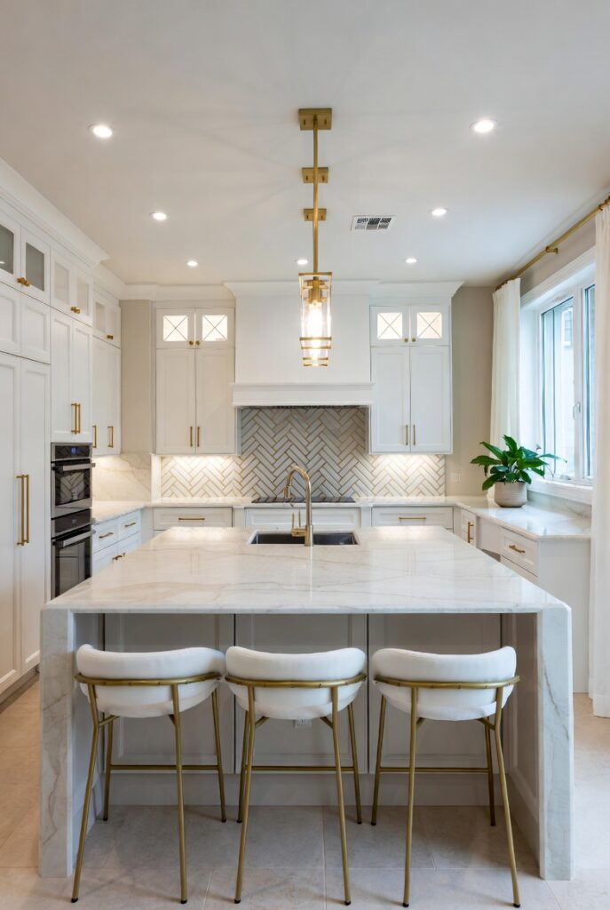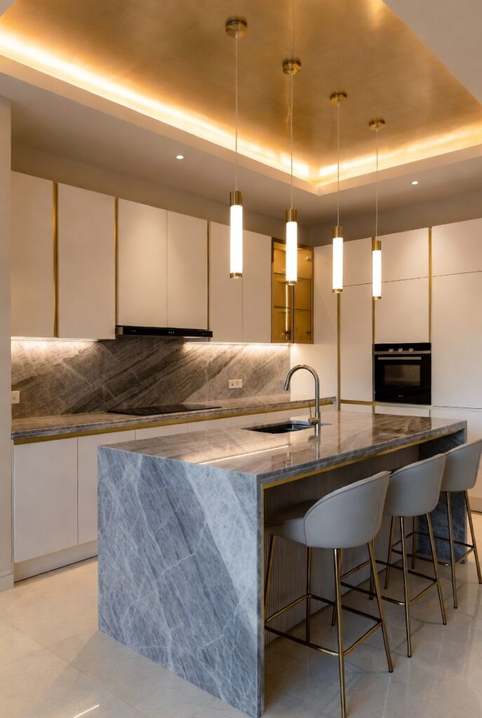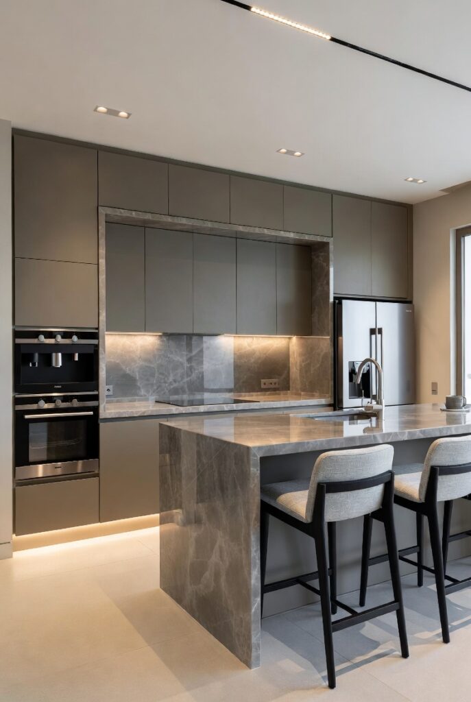 Marble kitchens are the definition of quiet luxury. Large marble islands, waterfall countertops, and slab backsplashes create a seamless, sculptural look.
