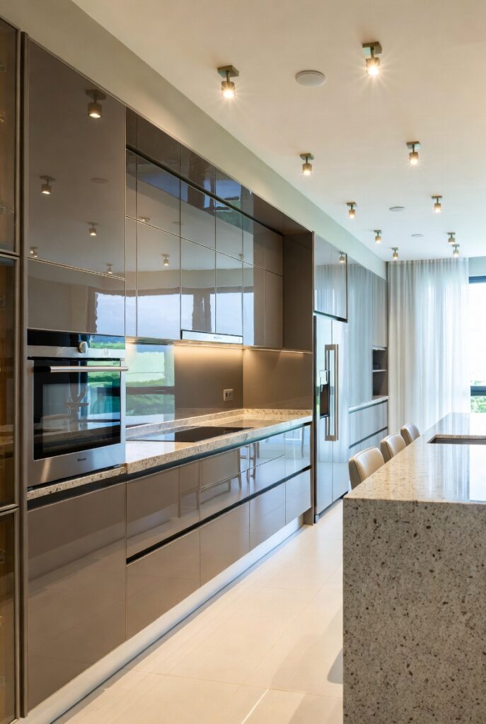 Lacquered cabinets and polished surfaces reflect light beautifully, making spaces feel larger and brighter.